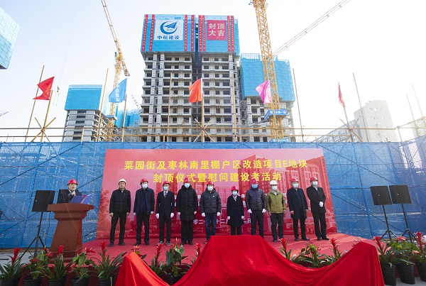 北京市西城区住房和城市建设委员会党组成员、副主任朱洲,西城区白纸坊街道工作委员会副书记牛清河,项目建设单位北京广安融盛投资有限公司董事长罗友发表致辞,对项目主体结构封顶表示祝贺,向各参建单位的辛勤努力和艰苦付出表示由衷感谢,希望各参建单位在后续的施工建设中精诚合作,共同打造精品标杆工程,为推进西城区棚改任务的全面胜利发挥积极作用,为当地群众带来幸福感和获得感。